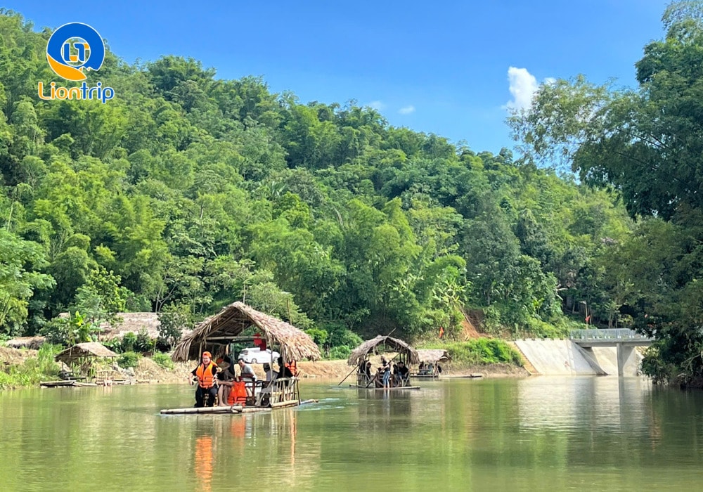 Tiếp nối hành trình, các thành viên Lion Trip đã trải nghiệm chèo bè tre trên dòng Suối Chàm trong xanh. Con suối hiền hòa uốn lượn giữa núi non xanh mát. Giữa không gian yên tĩnh, tiếng mái chèo khua nước, tiếng cười nói rộn ràng của mọi người tạo nên bức tranh bình dị nhưng giàu sức sống.